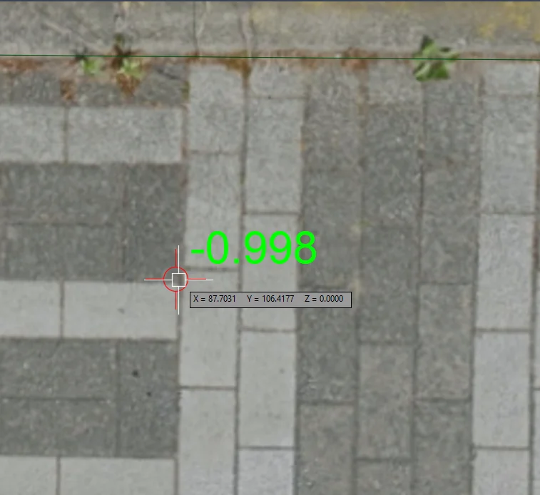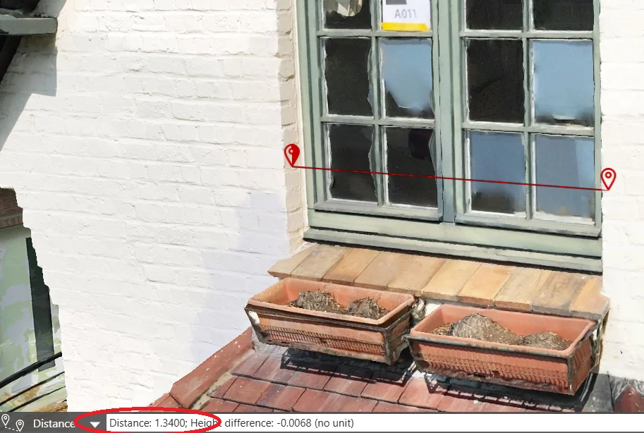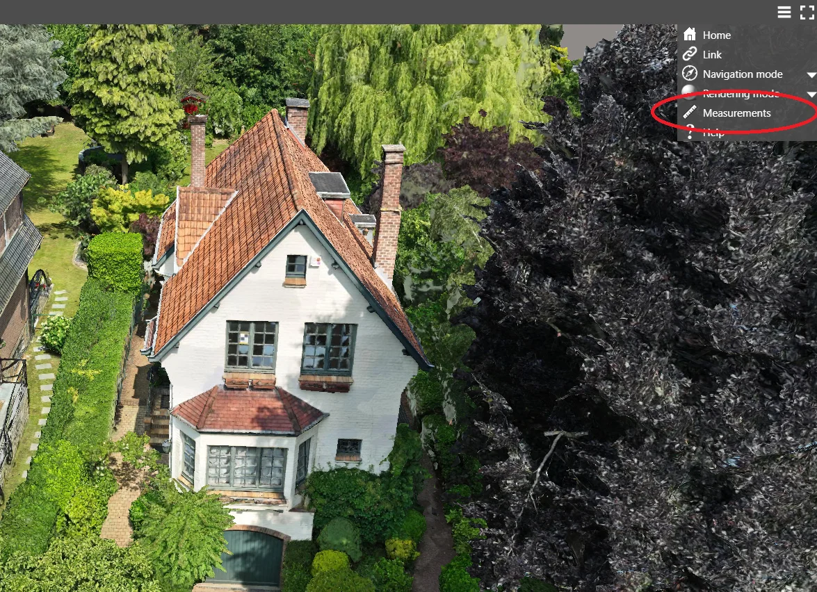 Nous utilisons toujours le seuil d’entrée en pierre bleue comme référence (00.00 m). Cela permet de calculer facilement les différences de hauteur (corniches, façades, etc.) directement dans le viewer.